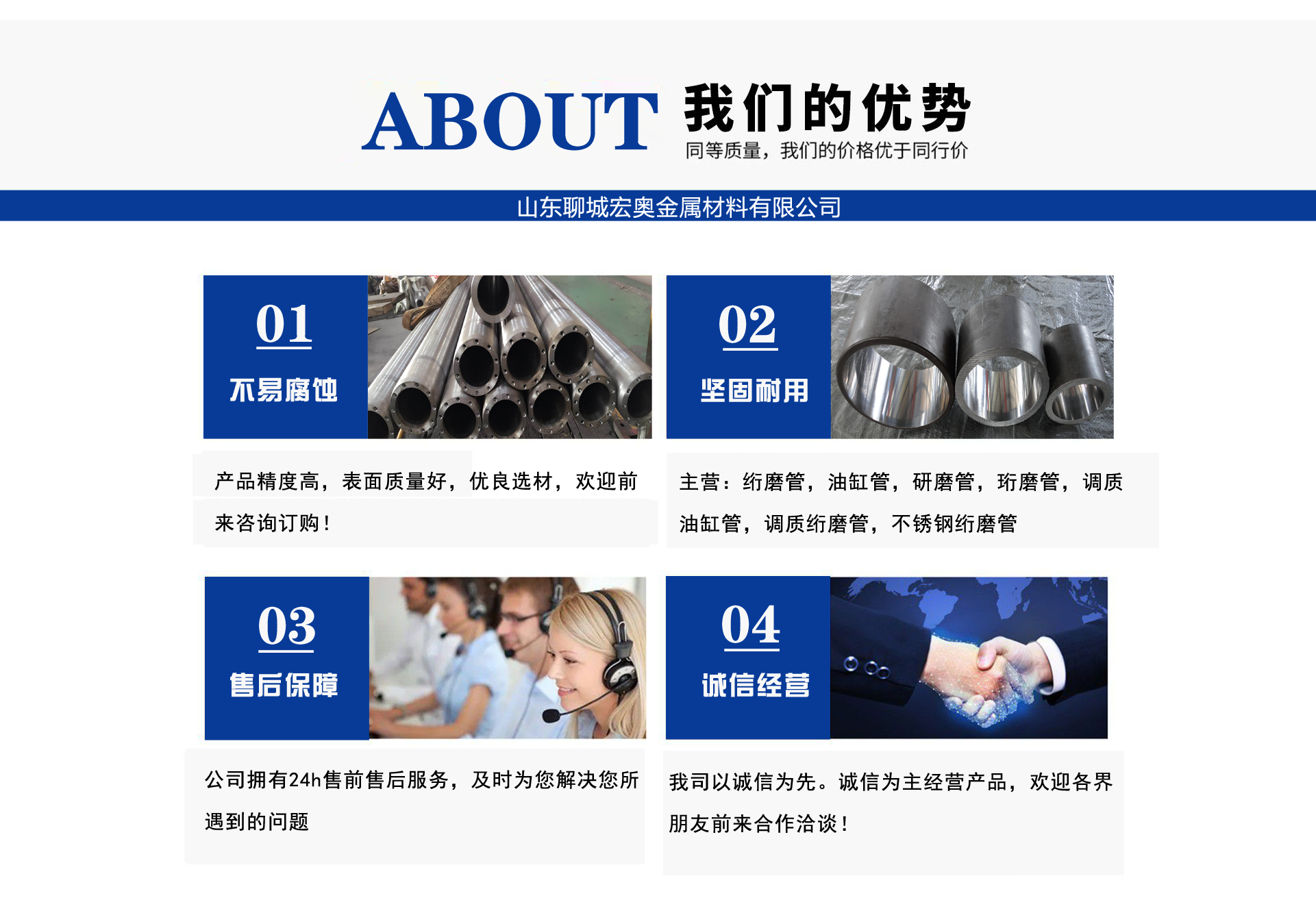 山東聊城宏奧金屬材料有限公司位于風景秀麗的江北水城-聊城。地理位置優越,交通便利。主營絎磨管,油缸管,研磨管,珩磨管,調質油缸管,調質絎磨管,不銹鋼絎磨管等產品 廣泛應用于礦山、起重、船舶、煤炭、運輸、化工、科研、軍工等工業領域。 公司憑借雄厚的實力,豐富齊全的規格品種,完善的質量保證,合理的價格,優質的服務,不斷地受到新老用戶及業內人士的肯定和信任,我們本著及用戶之所及,想用戶之所想的服務宗旨不斷地拼搏,進取,在此對多年來支持我們的各行各業的新老朋友表示由衷的感謝,愿我們今后的合作更加愉快! 歡迎國內外新老客戶來公司視察、蒞臨指導工作!...